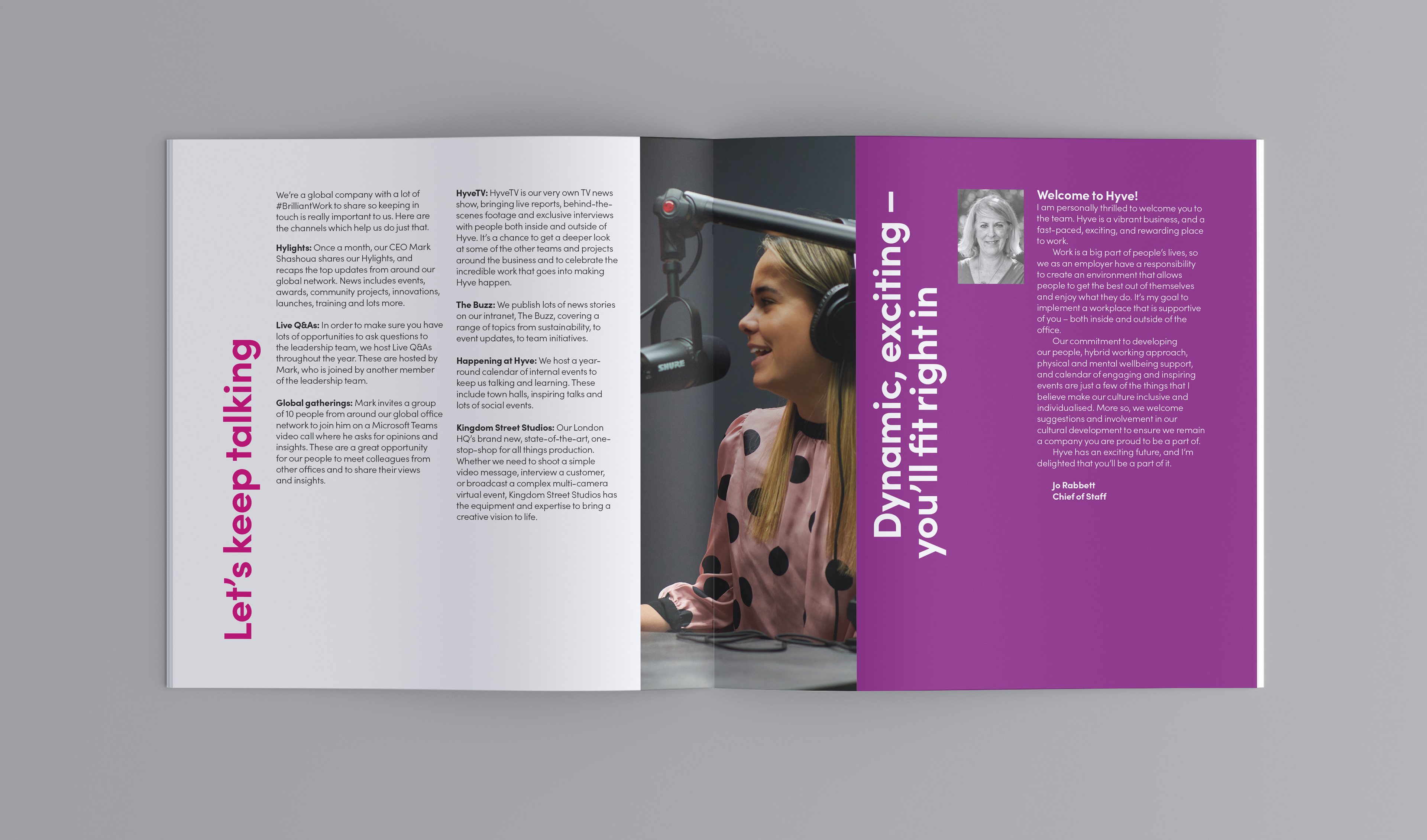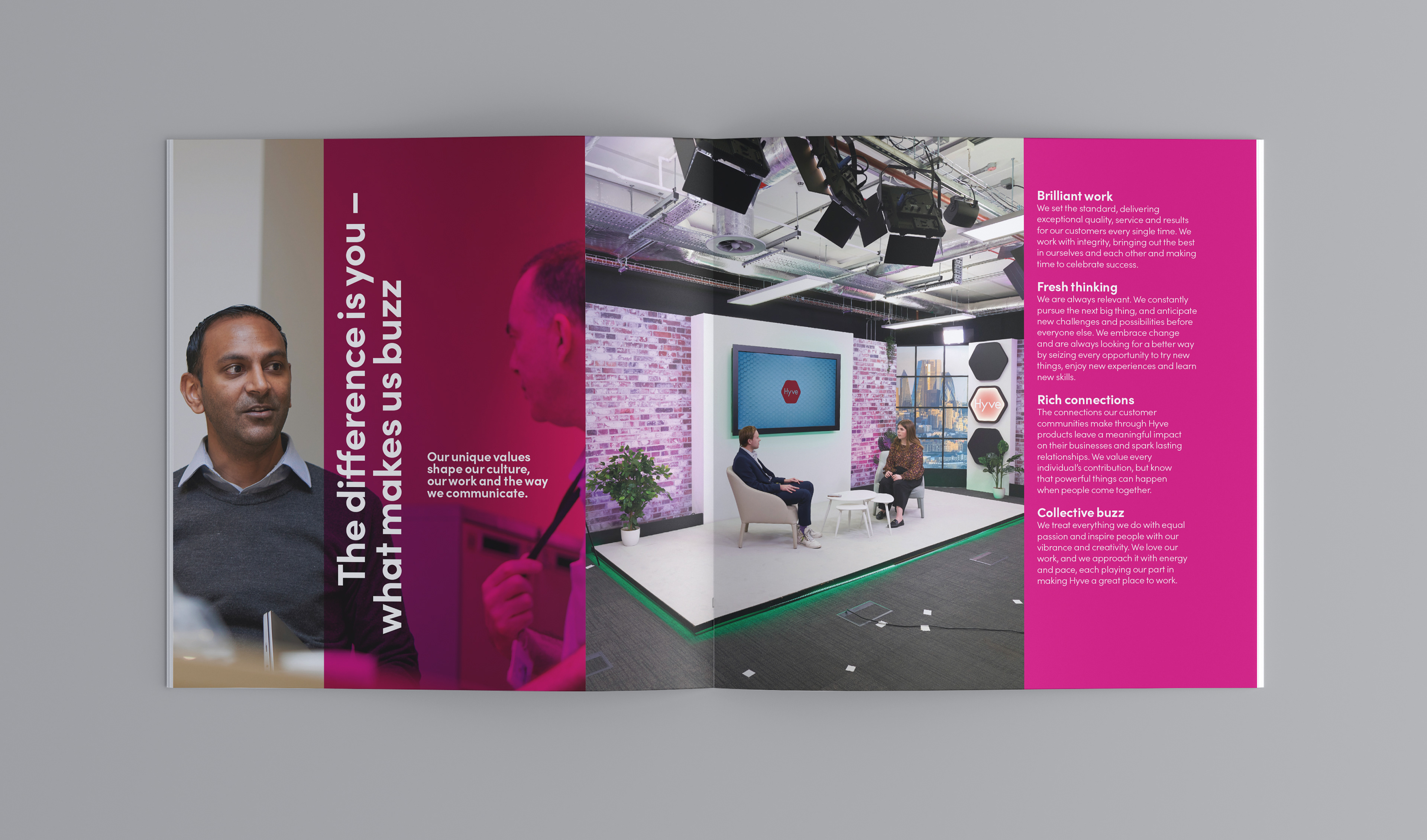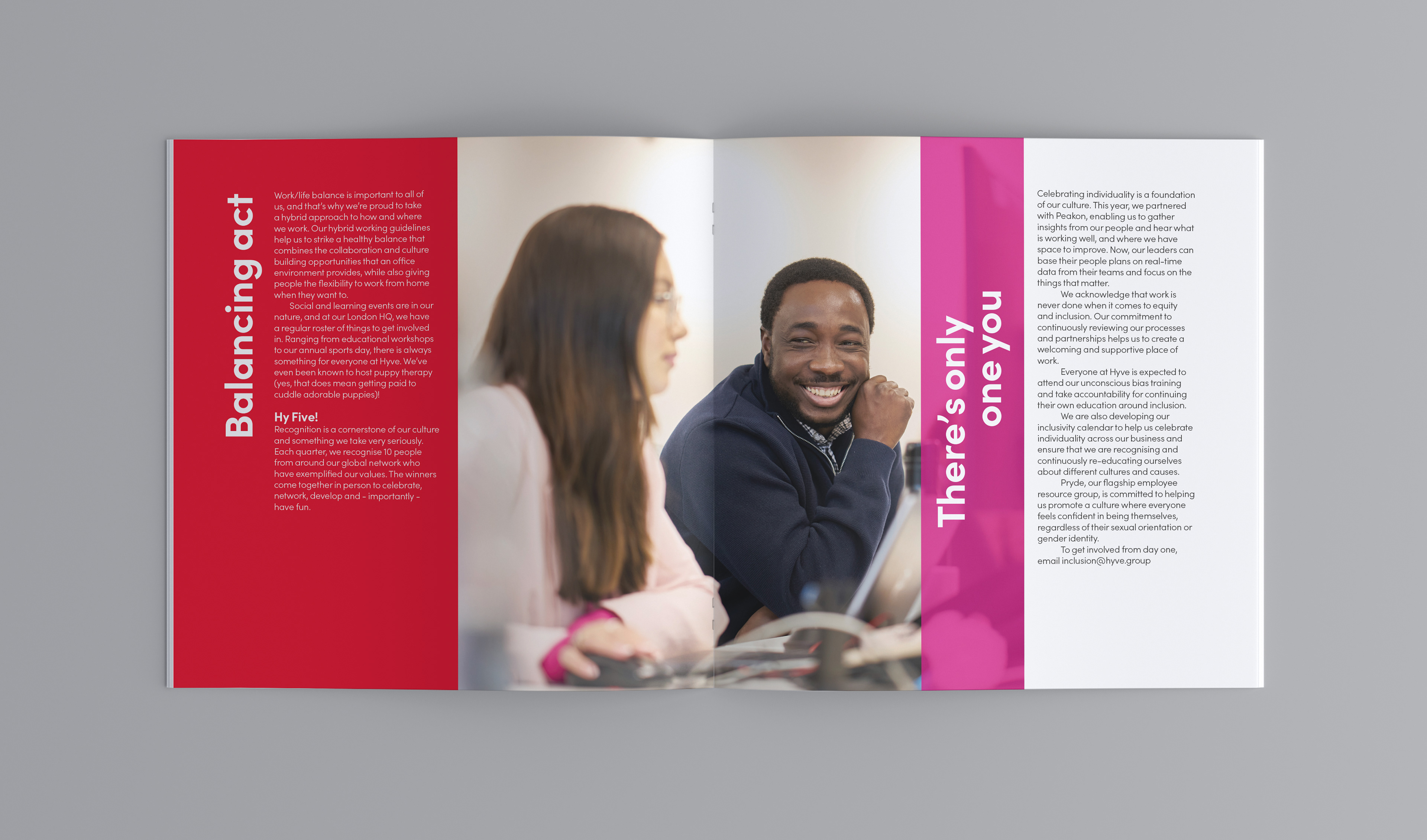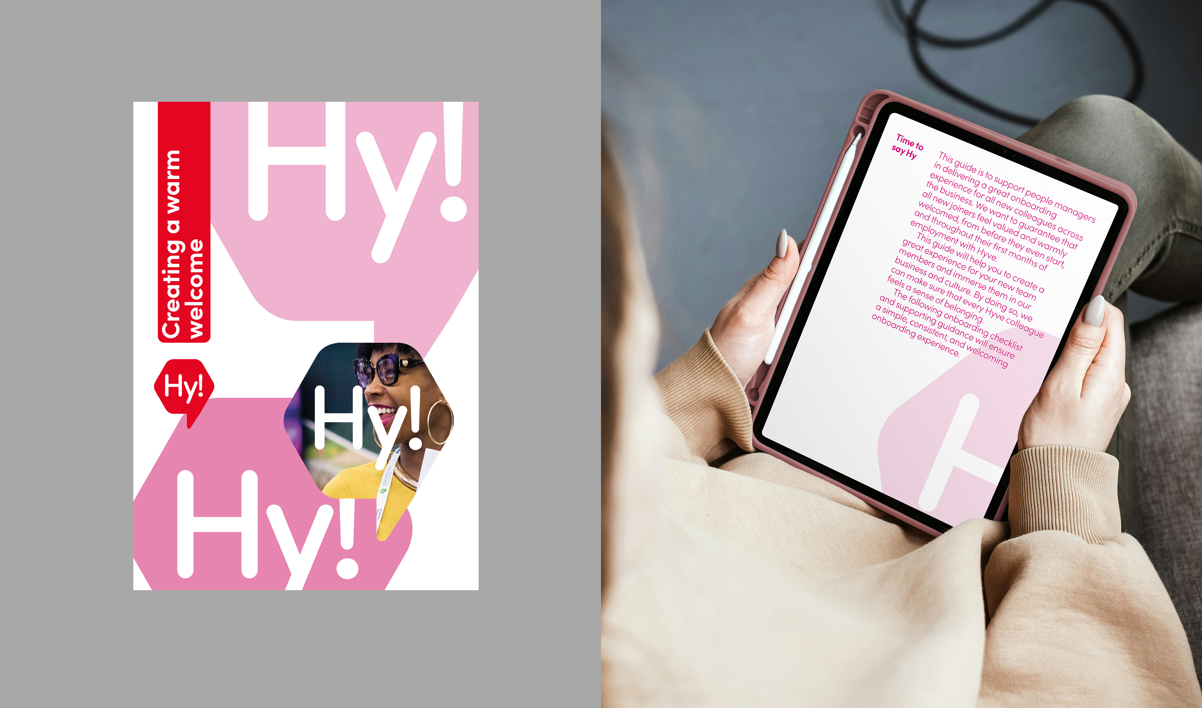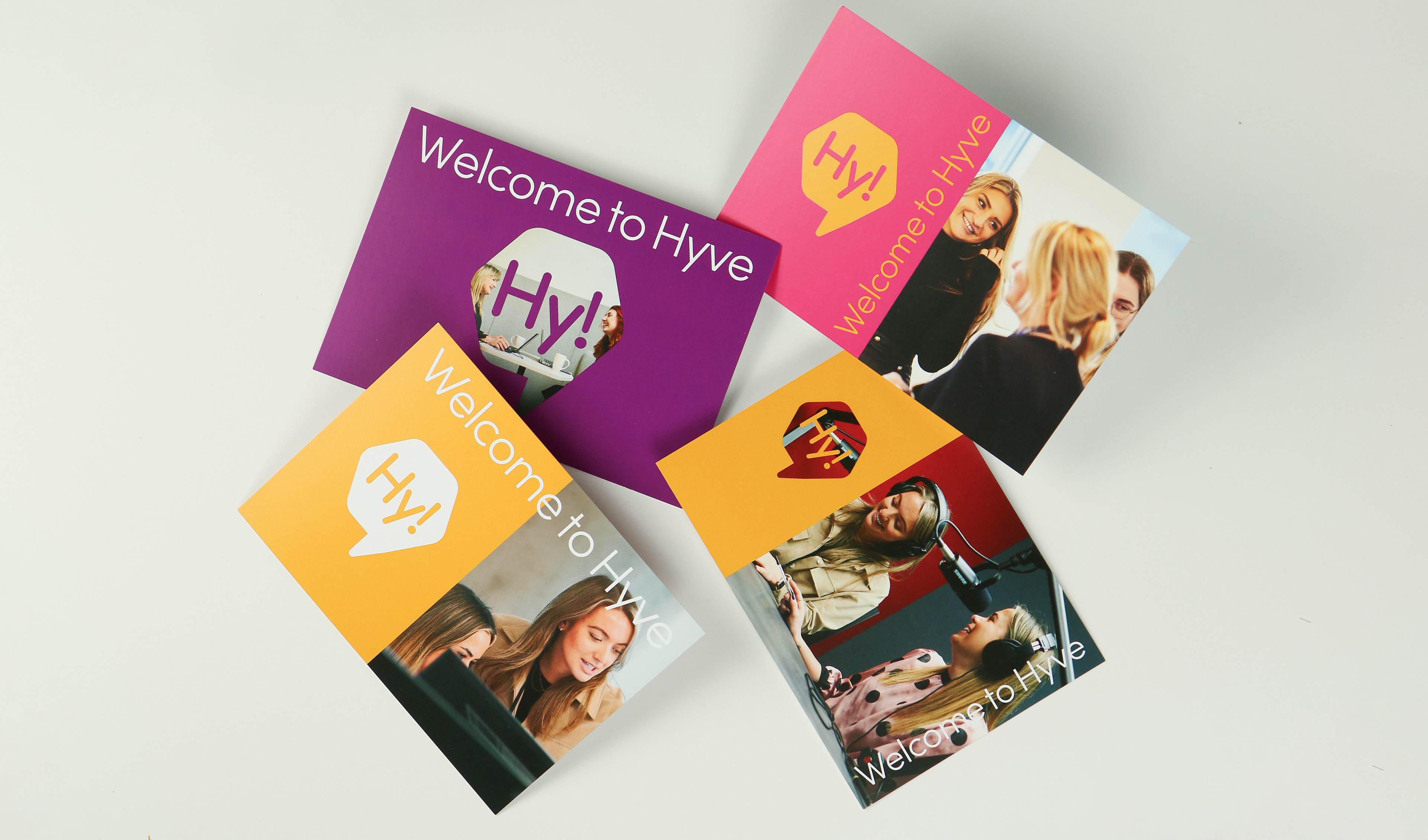 For global events company Hyve Group, we developed a sub-brand to engage new starters and graduates. Working from the core Hyve identity, we collaborated with the client on naming to create Hy! The visual expression nodded to the parent brand while carving out its own confident, energetic tone. The identity was rolled out across starter pack collateral and digital manager toolkits to support the onboarding programme. Bright, fun and distinct, the look balances playfulness with brand coherence.