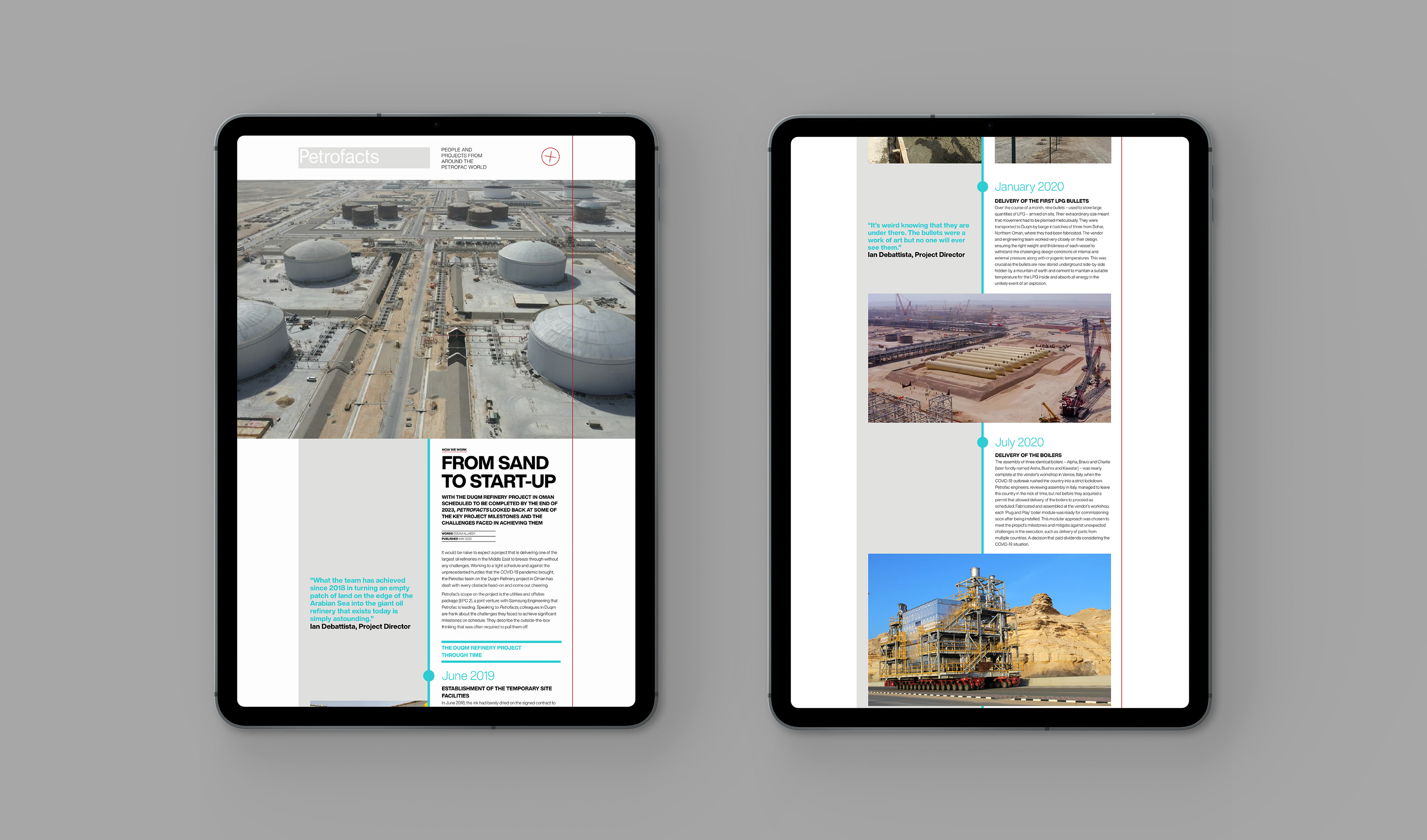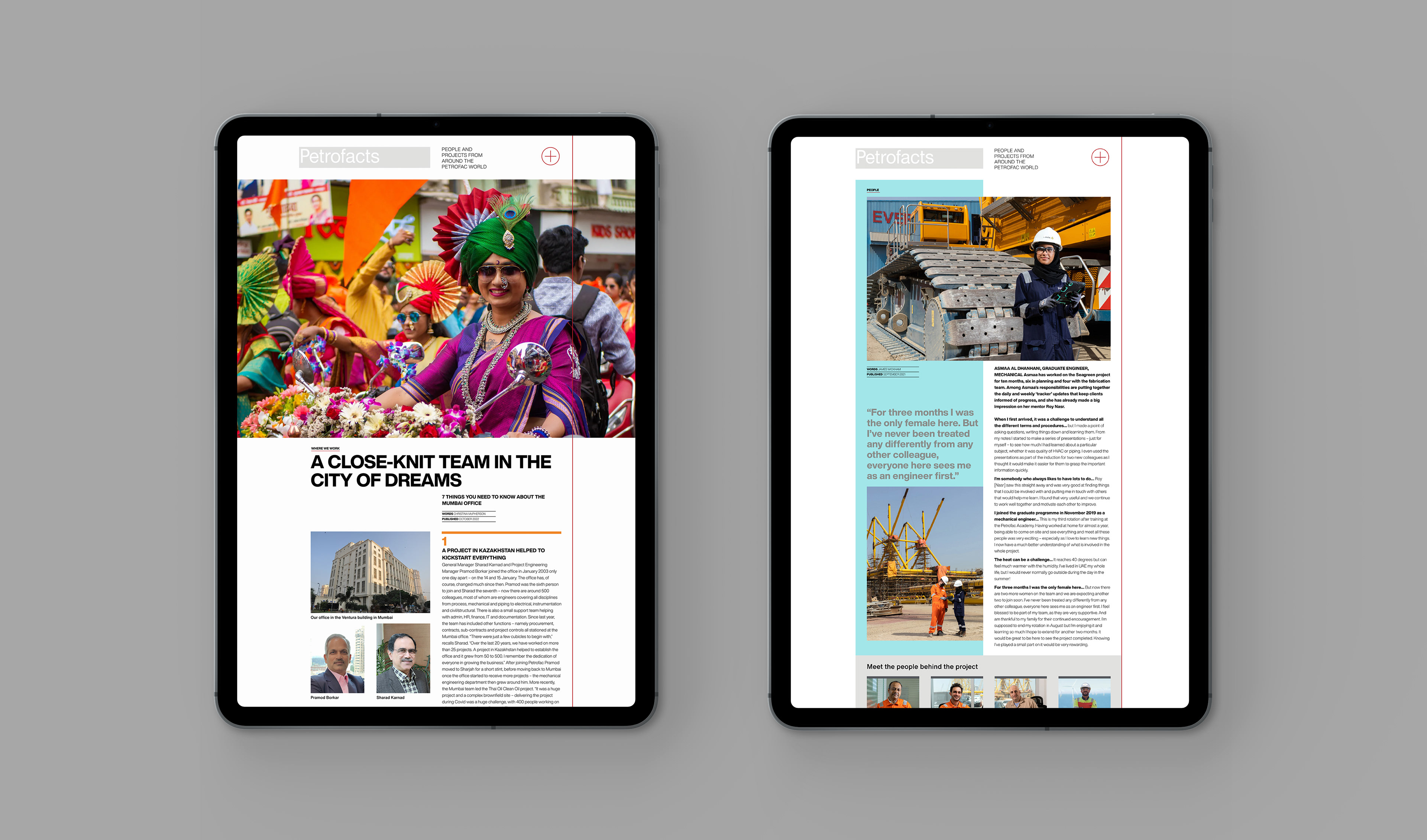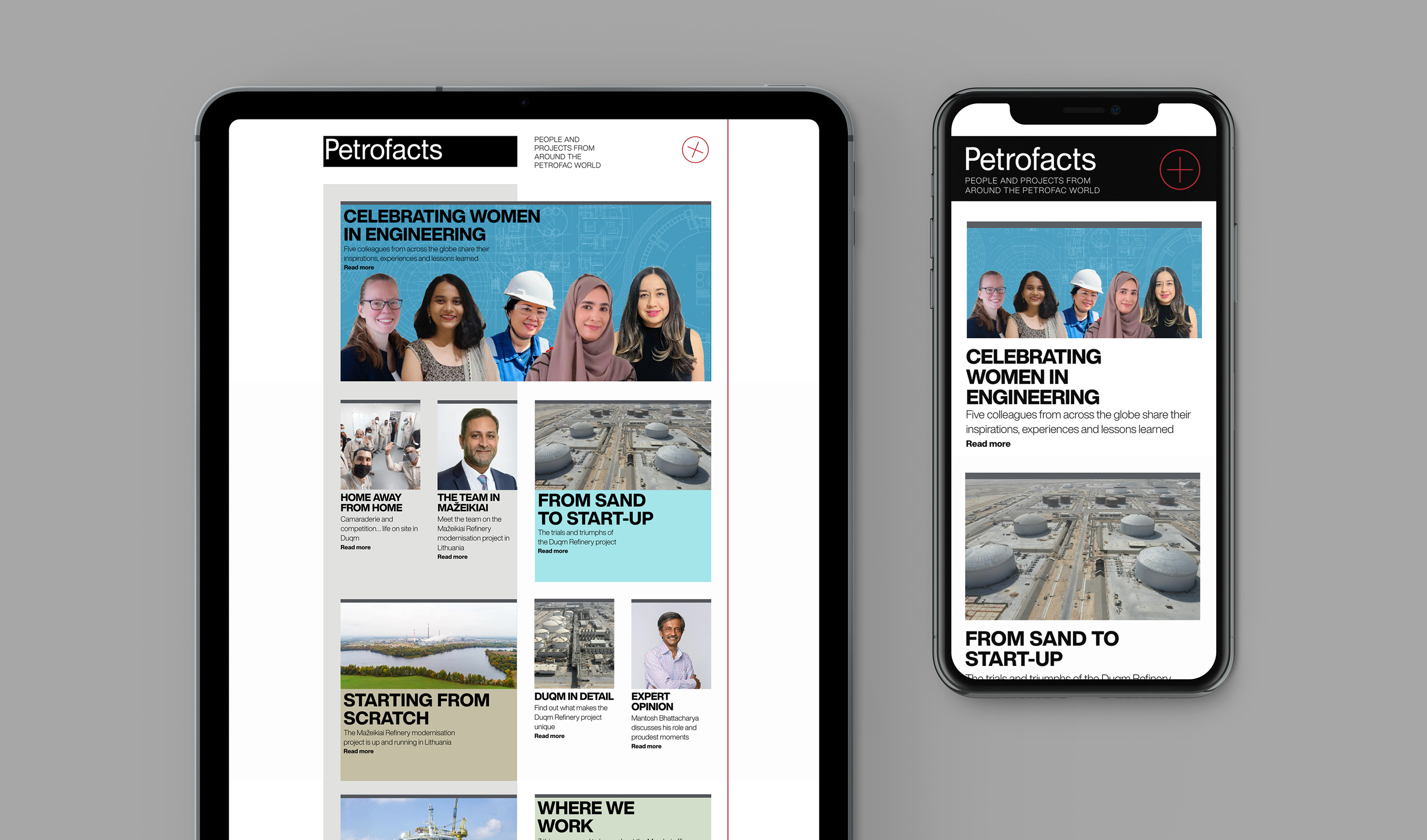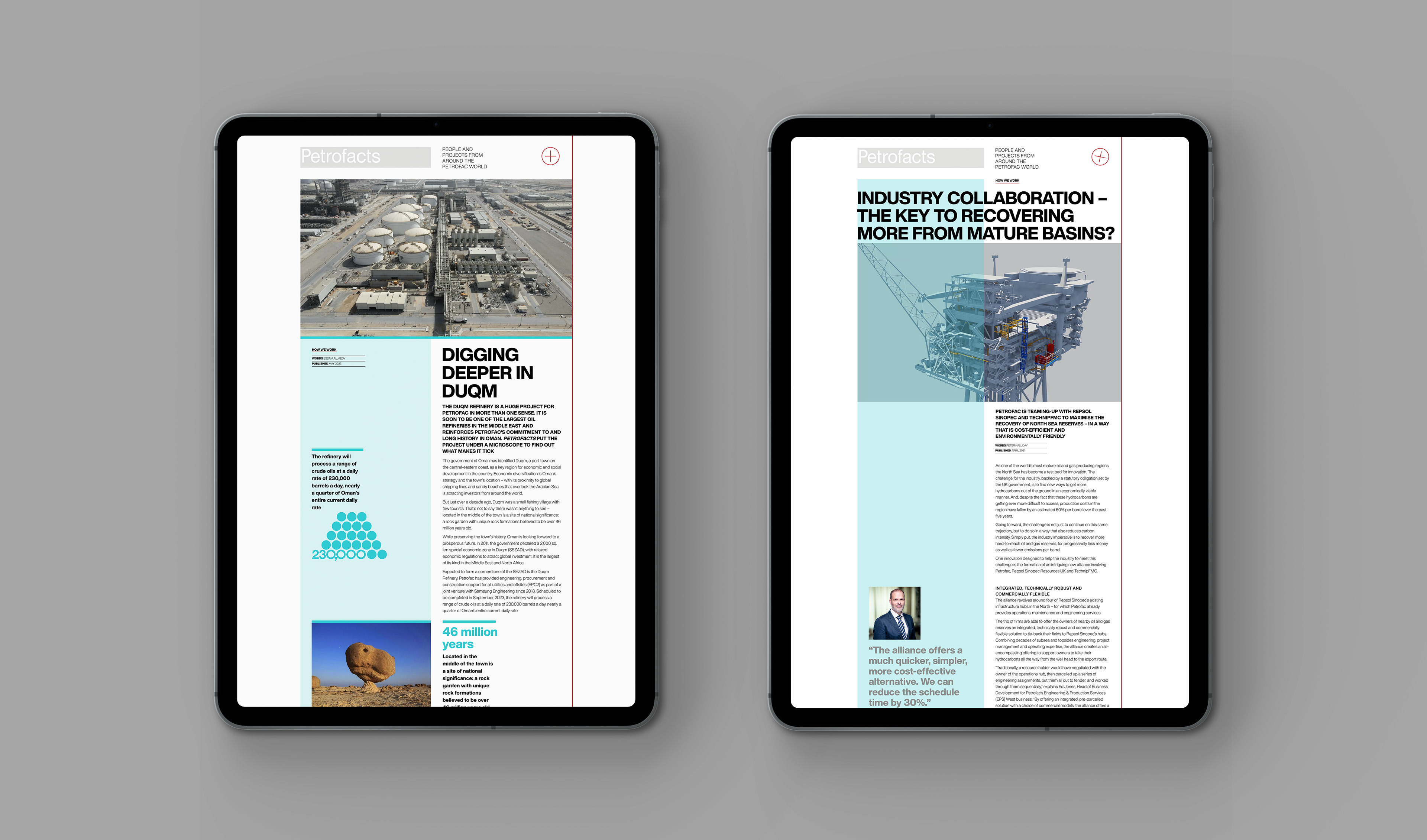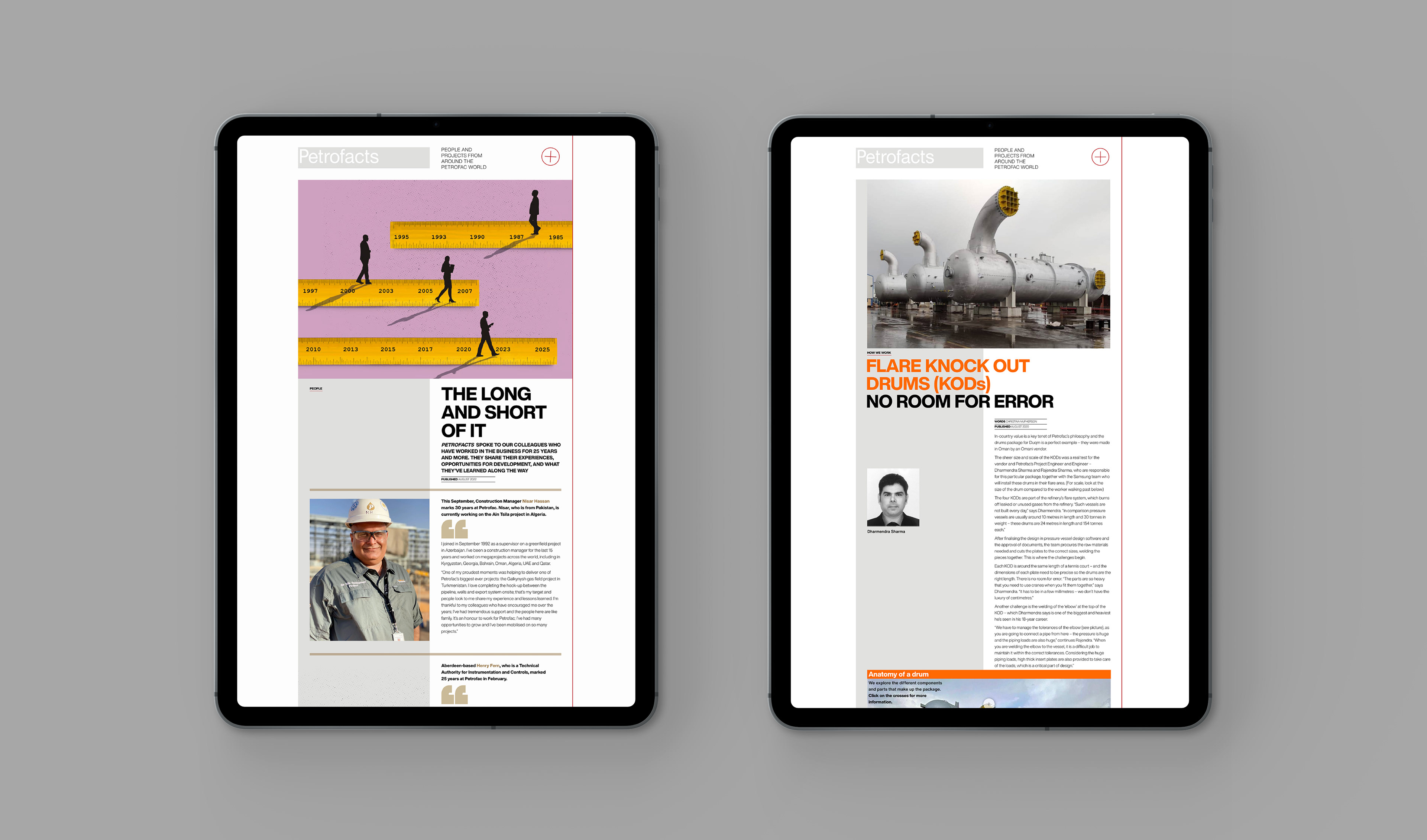 In line with Petrofac’s group-wide focus on digitalisation, their established publication, Petrofacts, transitioned from print to digital. With a design-led approach that prioritised editorial flexibility over rigid templates, we recommended no-code content build tools, enabling bespoke story layouts. Responsiveness was embedded from the outset, ensuring a seamless experience across desktop, tablet, and mobile – resulting in a digital publication that carried over editorial and print design integrity, while embracing video and animation capabilities of the web.